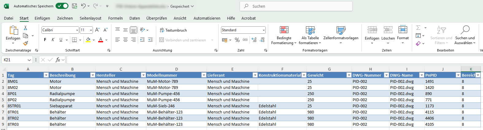 Viele Anwender empfinden den direkten Export aus AutoCAD Plant3D Datenmanager einfacher, zumal dieses Werkzeug im Planungsalltag ohnehin häufig zum Einsatz kommt. Dabei stehen Dateiformate *.xlsx und *.csv zur Verfügung. Leider sind die Ausgaben nicht über eine Vorlage *.xltx formatierbar. Das heißt auf die Formatierung hast Du keinen Einfluss.