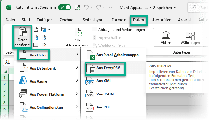 Erstelle eine „leere“ MS Excel Arbeitsmappe und importiere anschließend  Daten aus der zuvor exportierten *.csv-Datei