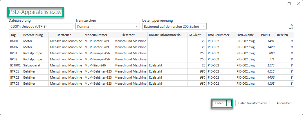 Exportiere Daten per AutoCAD Plant3D Datenmanager in eine *.csv-Datei.