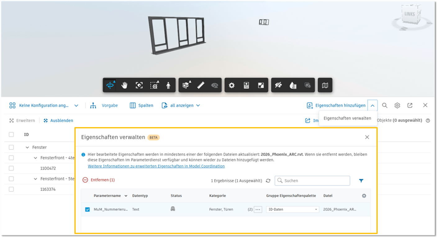 Nachdem die Parameter im Modell verfügbar sind, beginnt die Arbeit der ACC Anwender. Mithilfe der Filterfunktion wird die Auswahl der Bauteile gezielt ermöglicht und die Eingabe der Parameterwerte erfolgt anschließend. Wir haben in dem Beispiel Werte für eine Raumzuordnung an den Fenstern hinterlegt.