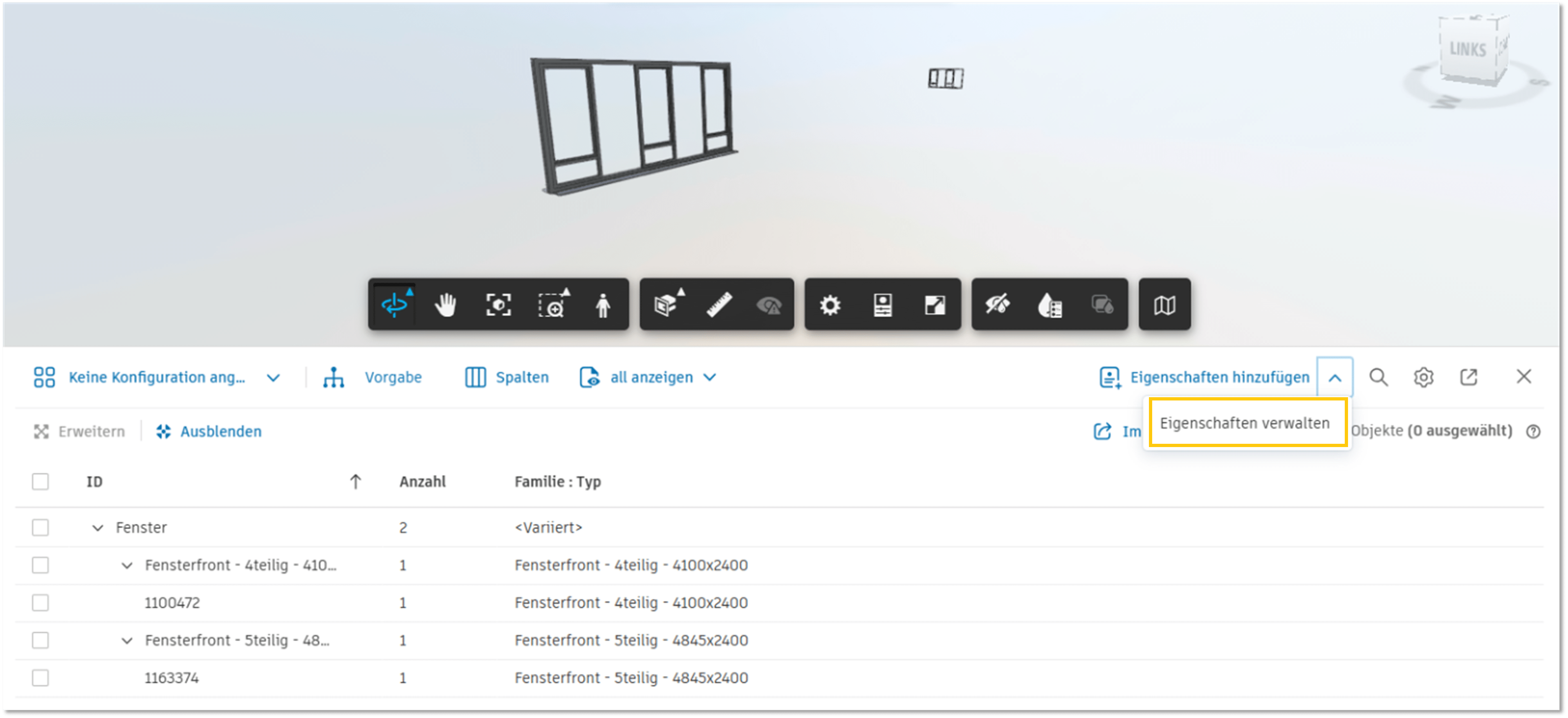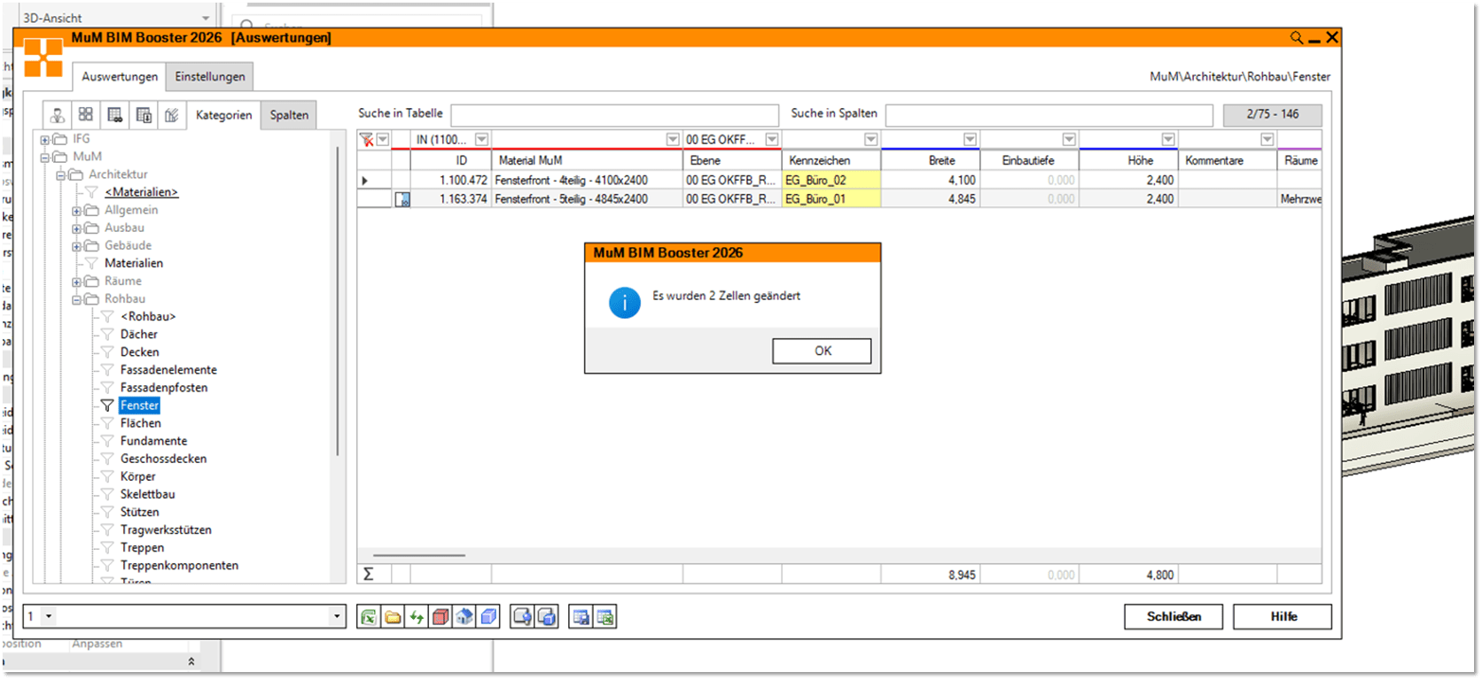 Die Bauteilinformationen werden zuerst bei den Elementen ergänzt und abschließend mit einem Speichern übertragen. Die Daten können nun zum Beispiel bei einem Bestandsprojekt am Modell abgerufen werden.
