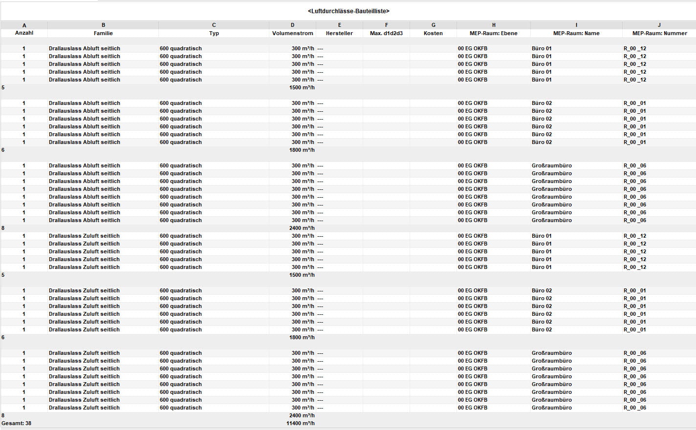 Praxisbeispiel: Bauteilliste für Luftauslässe