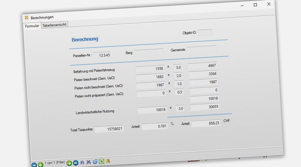 Das Abrechnungsteam hatte bisher komplexe Exceltabellen entwickelt, um die Entschädigungen zu ermitteln. Doch man suchte ein einfacheres Tool und wollte gleichzeitig eine zentrale, einheitliche Ablage einführen, um die Vielzahl der Daten zeitgemäß verwalten zu können. Im Gespräch mit dem zuständigen Vermessungsbüro, der Baumann Vermessungen AG aus Saanen, wurde klar, dass ein geografisches Informationssystem helfen könnte. Zusammen mit dem GIS-Dienstleister RSW AG entwickelte man eine passende, erstaunlich einfache Lösung, die GIS-Daten aus einer Oracle-Datenbank nutzt und die Berechnungsergebnisse über MuM MapEdit grafisch und numerisch darstellt.