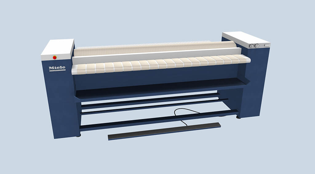 Gruppenleiter Axel Schwarz und präsentiert den Blick in eine Professional-Mangel mit Einsicht in die langlebige Technik des Gerätes.