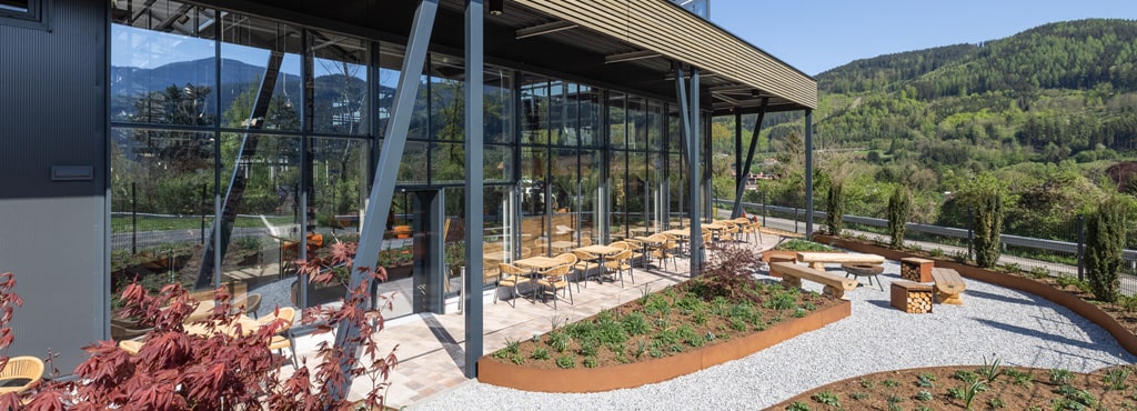 Das Projekt Gartenwelt Schacherl im österreichischen Bruck an der Mur zeigt, wie Architektur und Stahlbau perfekt zusammenwirken. Das Gartencenter bietet auf der 4.000 m2 großen überdachten und der 1.800 m2 großen Freiverkaufsfläche optisch und technisch einige Höhepunkte. Auffällig sind die anthrazitfarbenen Fassadenelemente, die pulverbeschichteten Stützen und die weitläufigen Glasflächen. Die markante Holzfassade mit der integrierten Verkaufsklappe erinnert an traditionelle Bauweise, während der moderne hinterleuchtete Schriftzug das Gartencenter auch in den Abendstunden zum Hingucker macht.